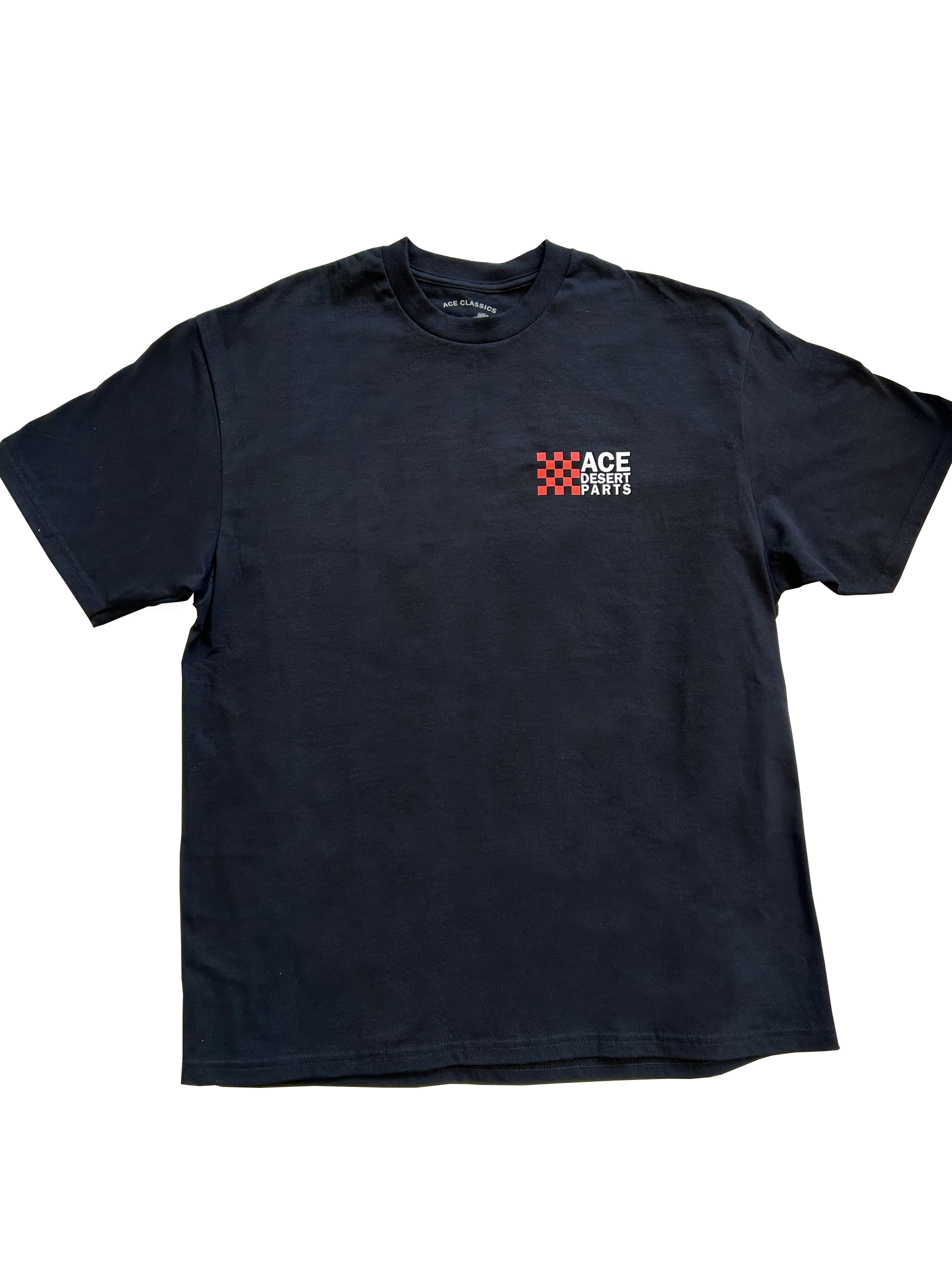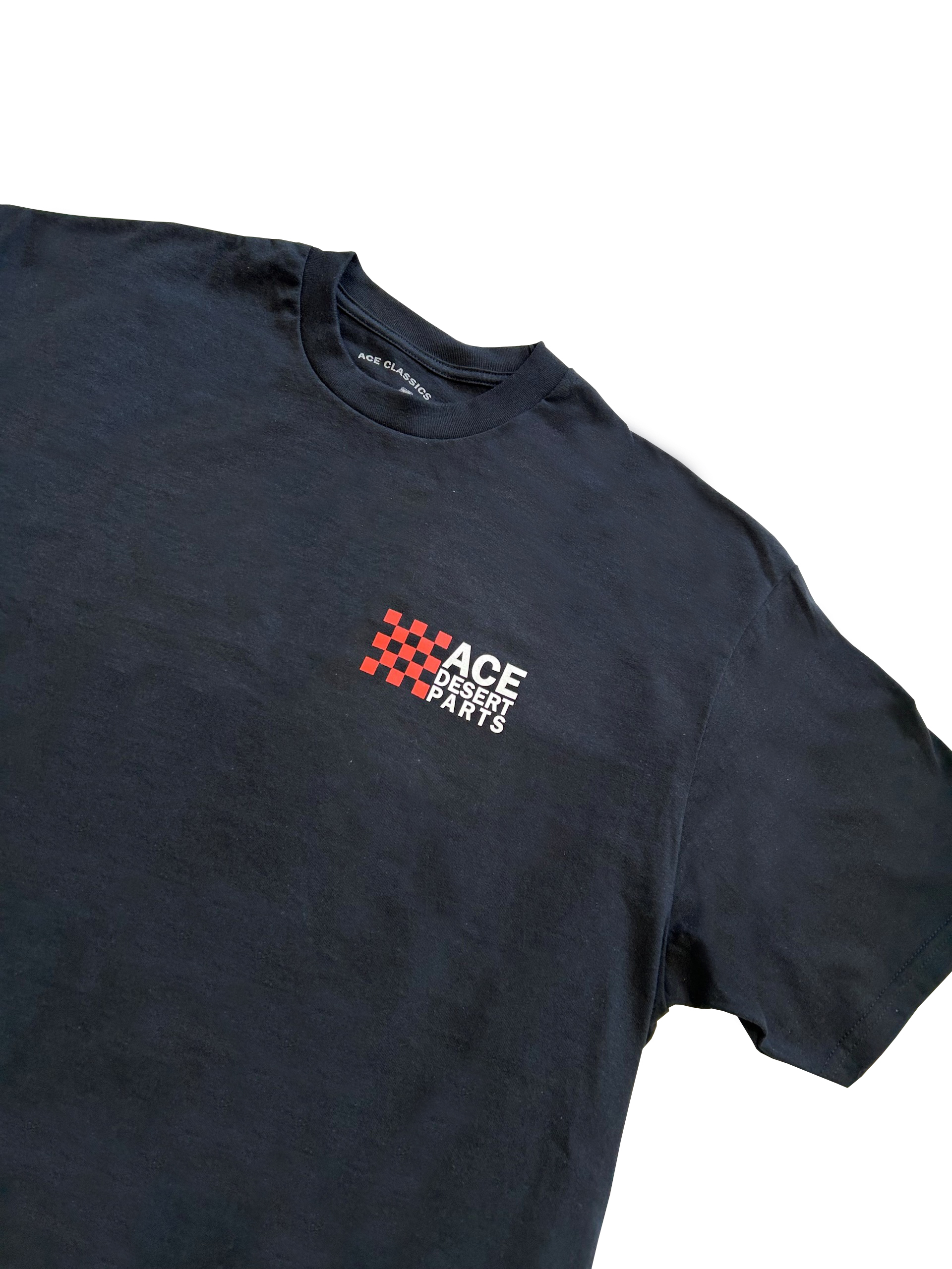 The M, L, XL, 2XL & 3XL t-shirts feature the Ace Desert Parts Chequered logo in small on the front.