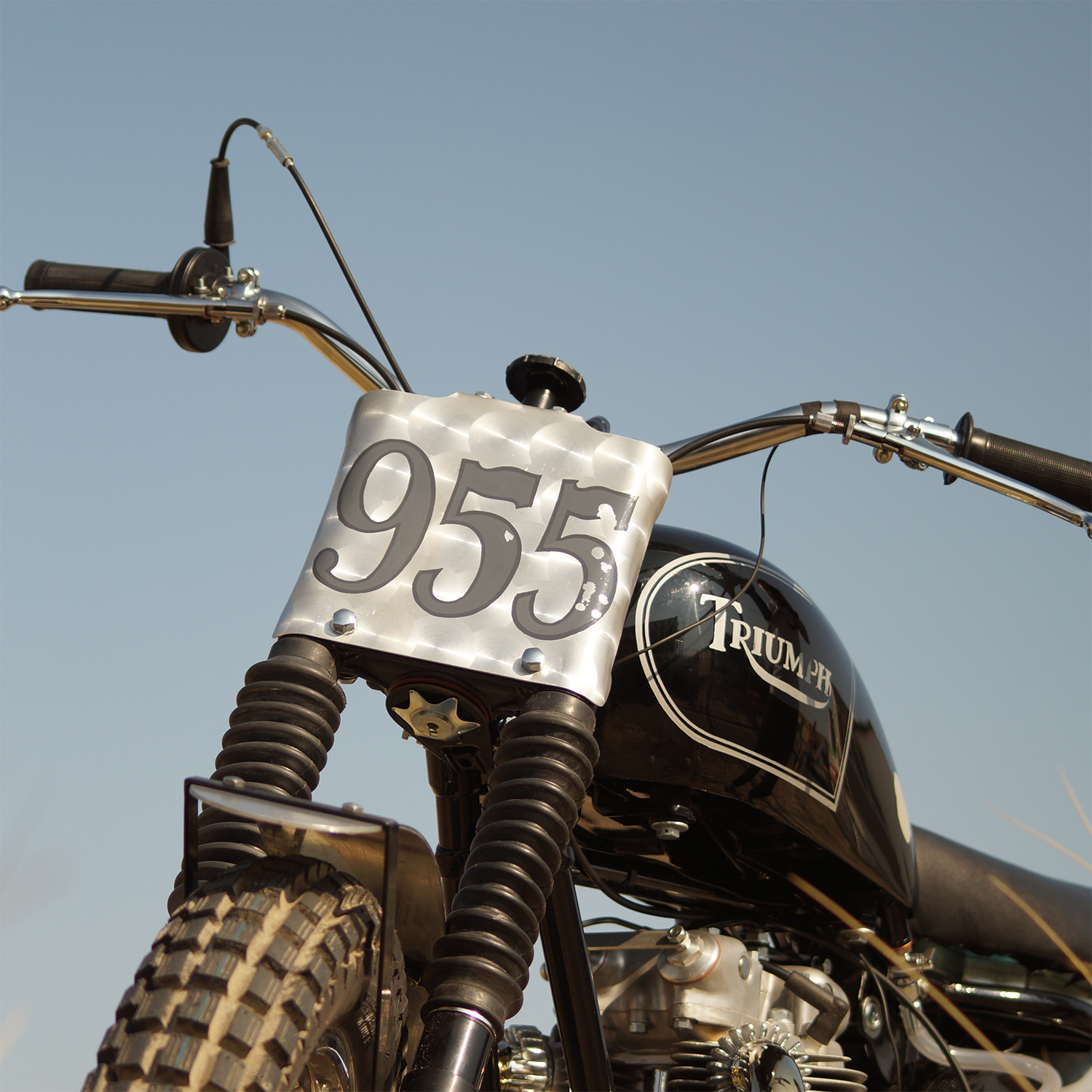 These alloy front number boards were a common thing seen on a lot of 1960’s Triumph Desert Racers. Bud Ekins made lots of his own desert parts and this was one of them, it gives the front of the bike a nice clean authentic look. These can be seen of our 502 and 955 Steve McQueen replicas.