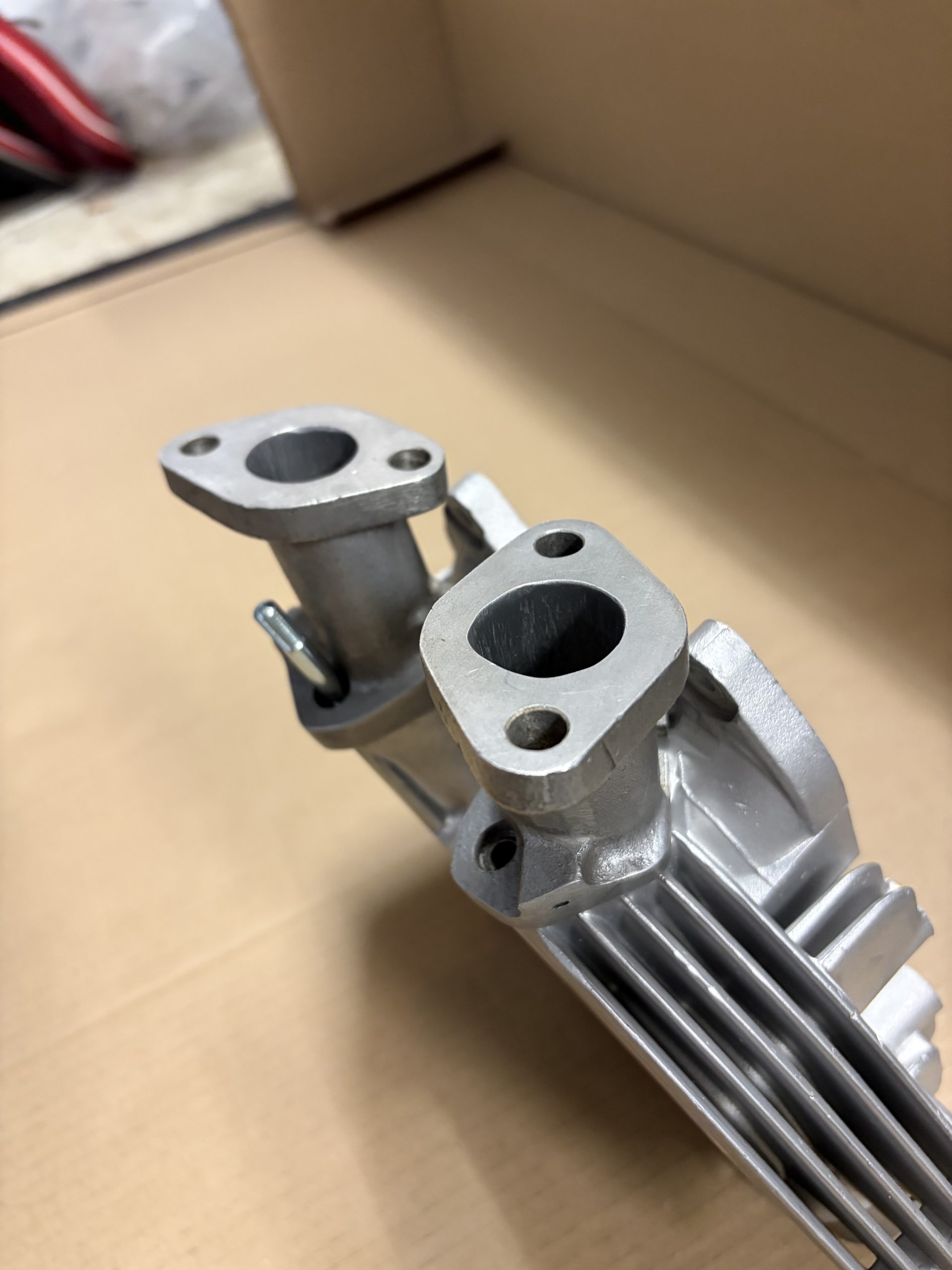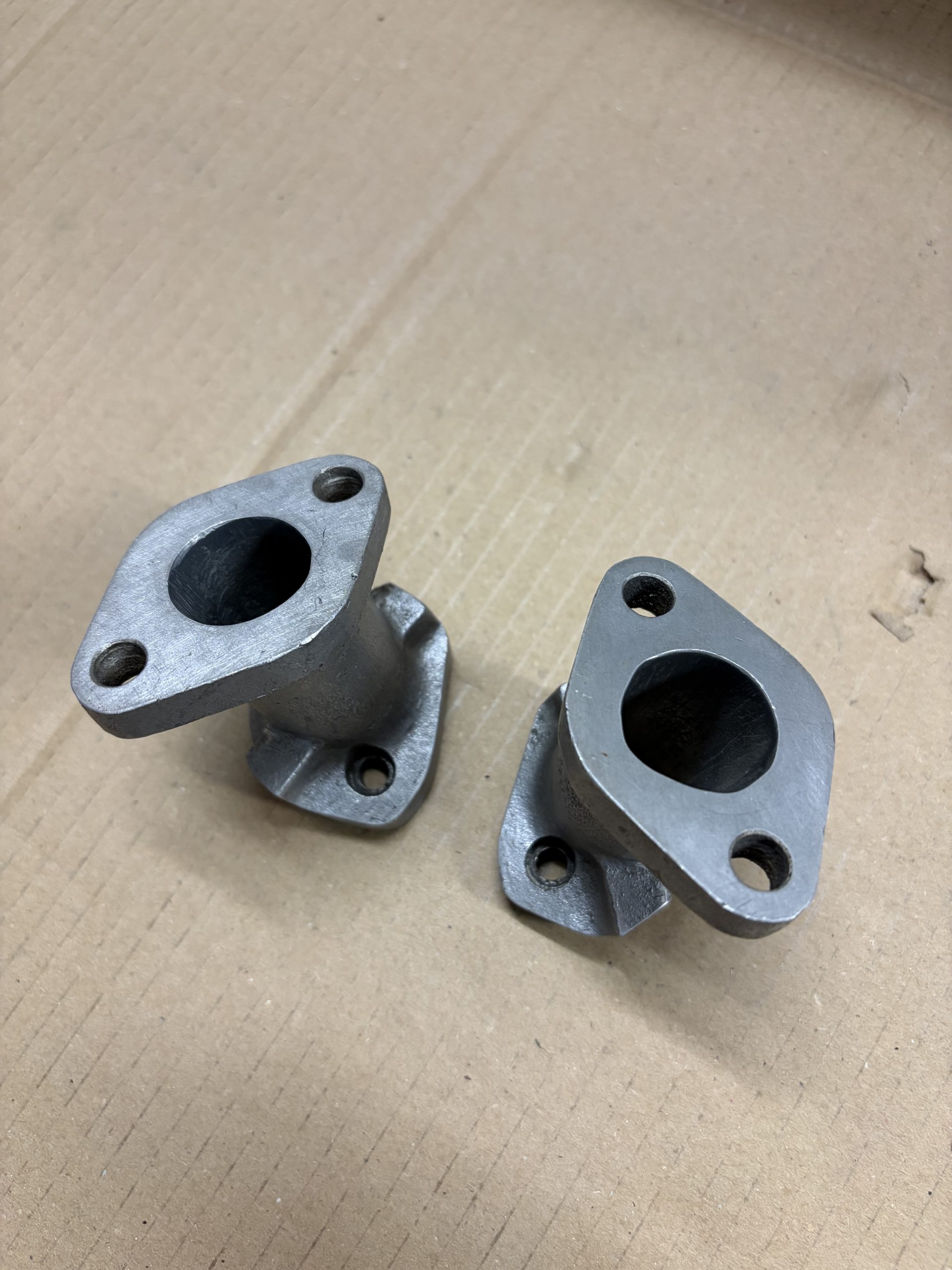 A pair of custom aftermarket alloy manifolds.