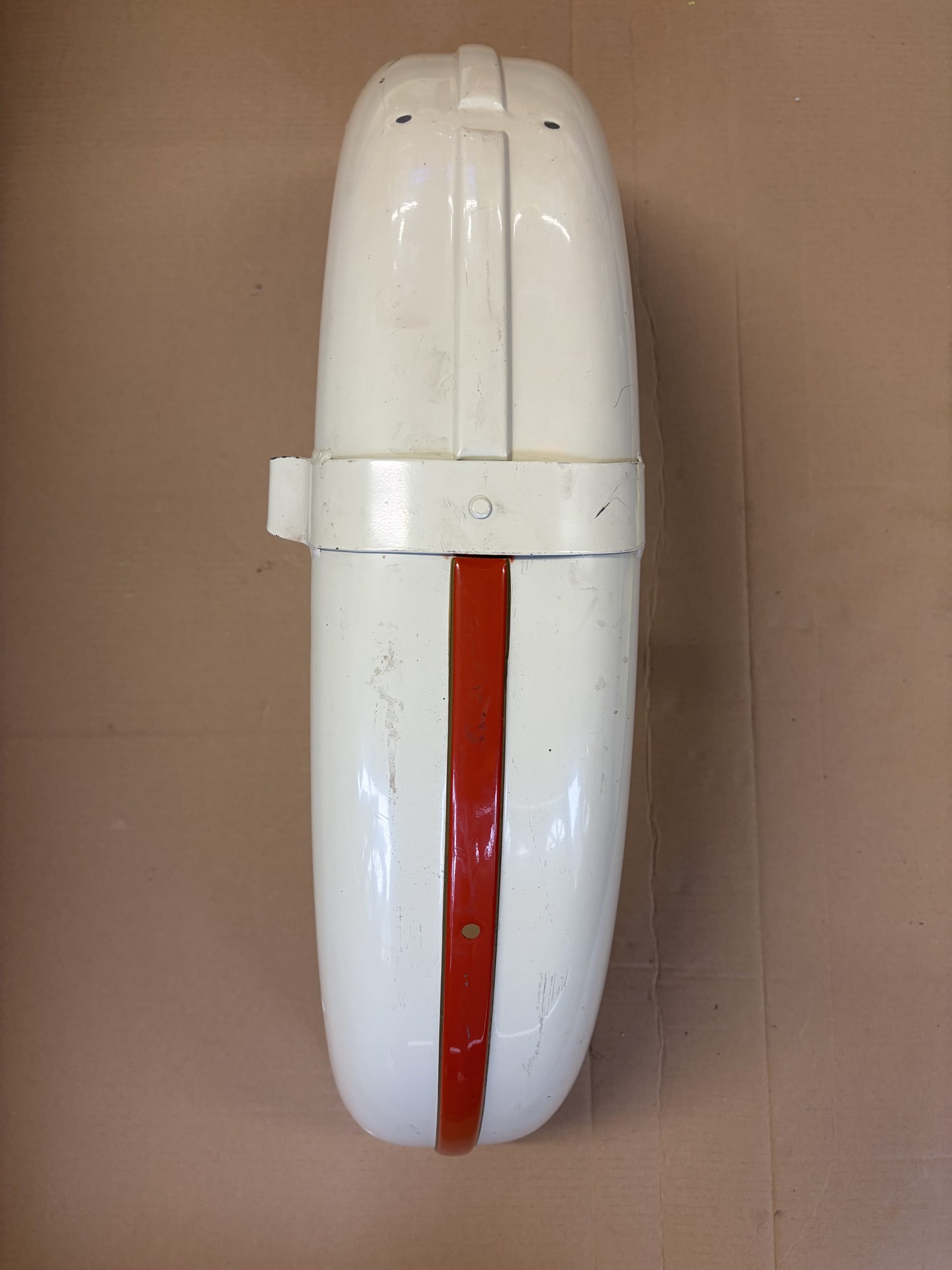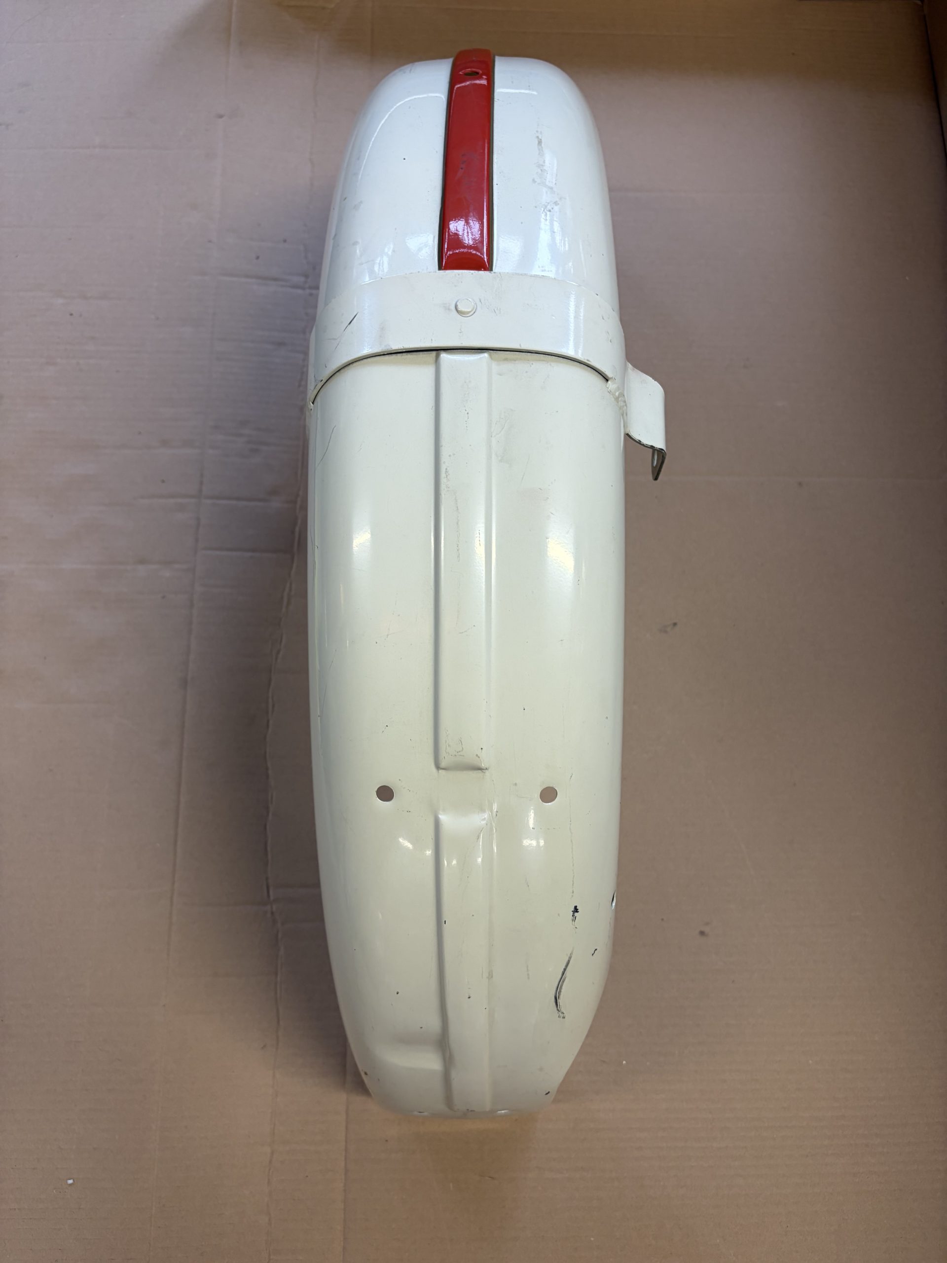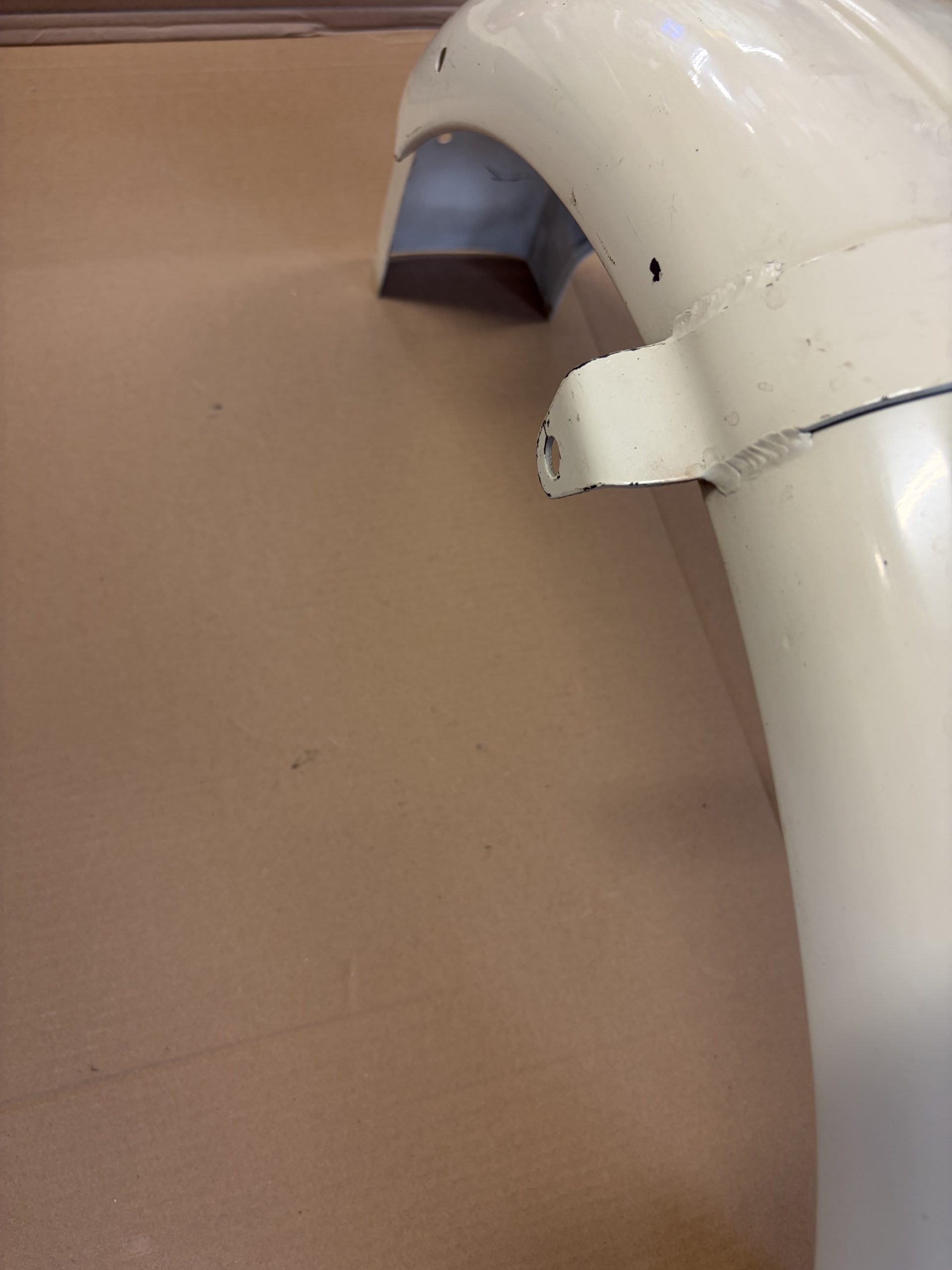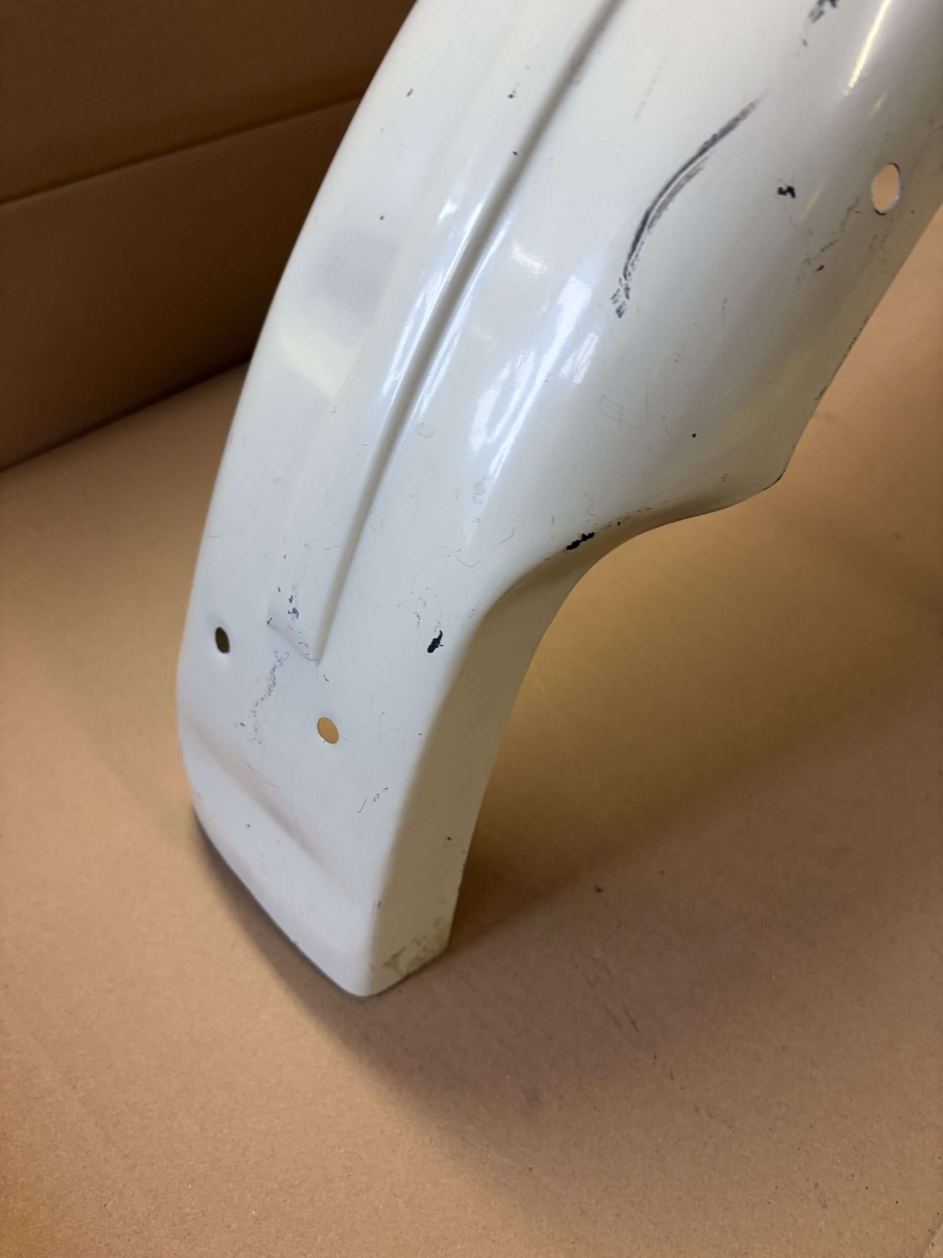 A genuine New Old Stock TR6 rear mudguard, painted in it’s original Aztec & Ivory Paint.