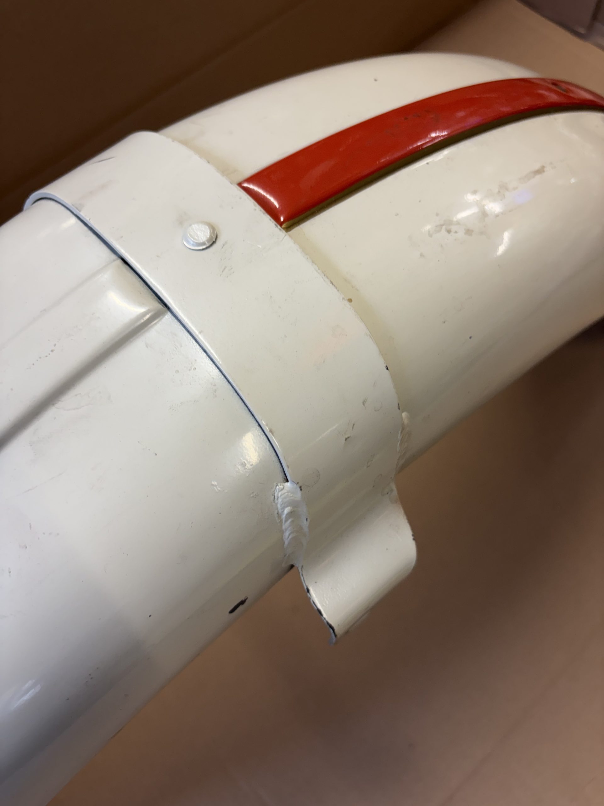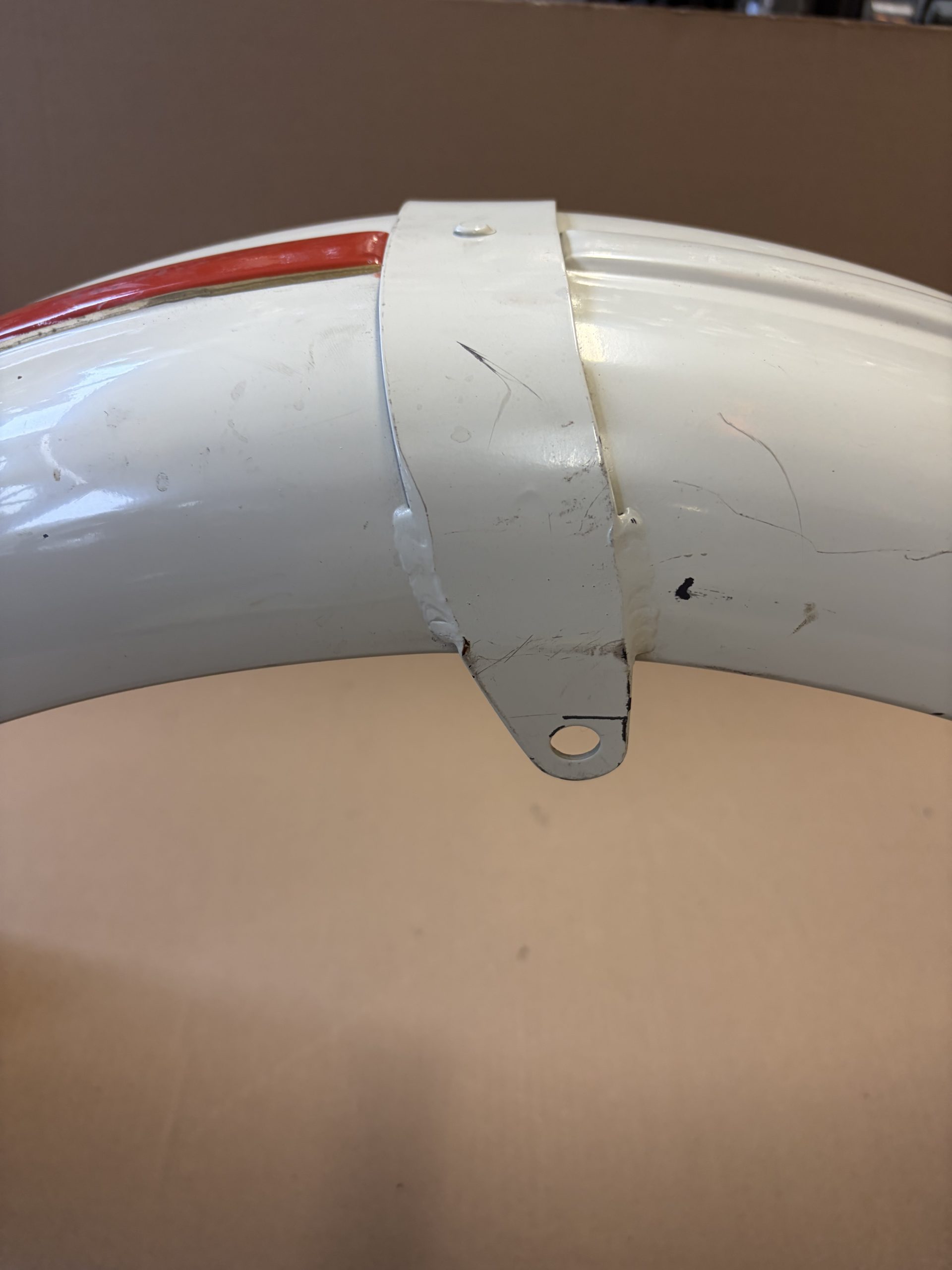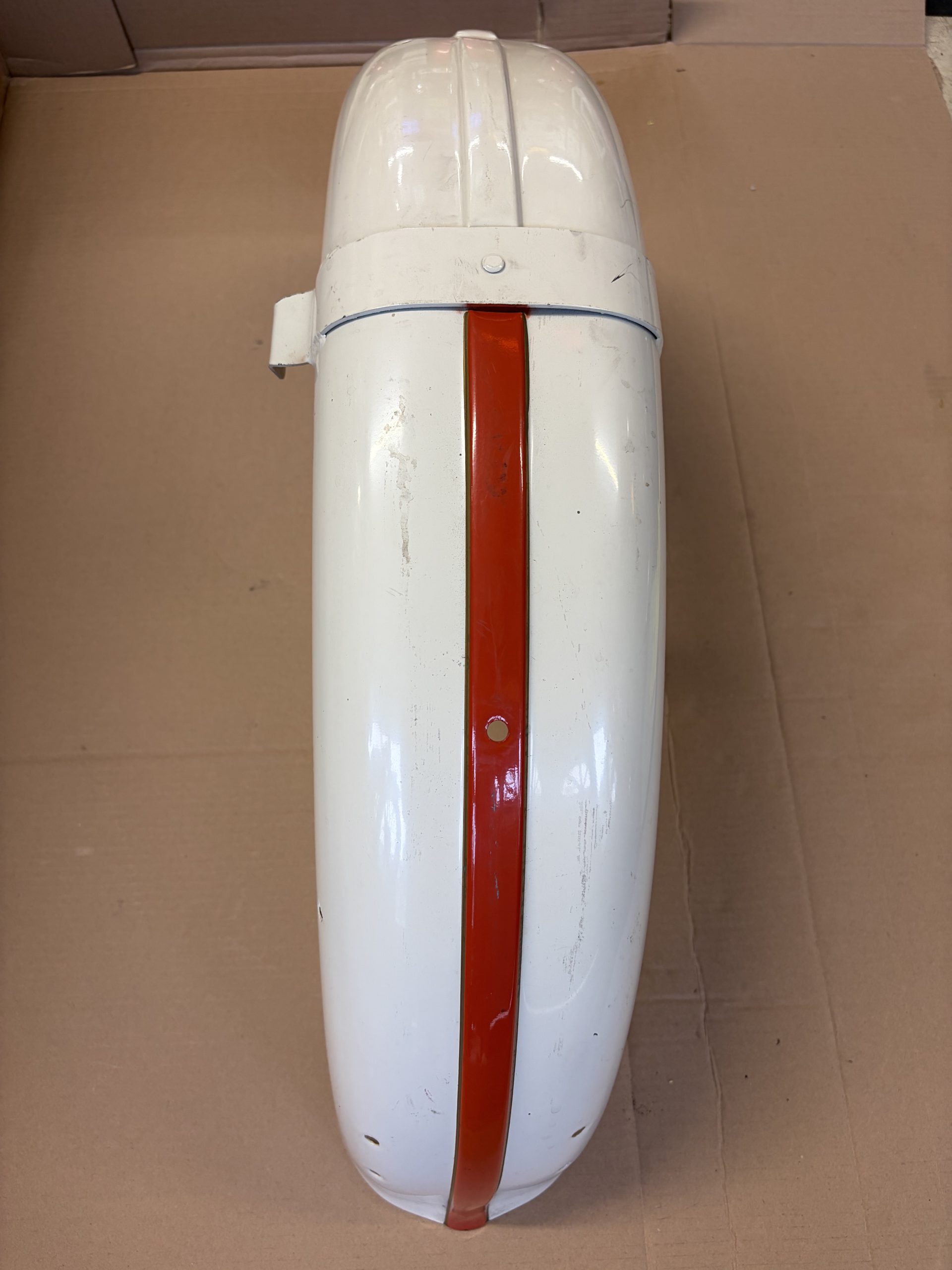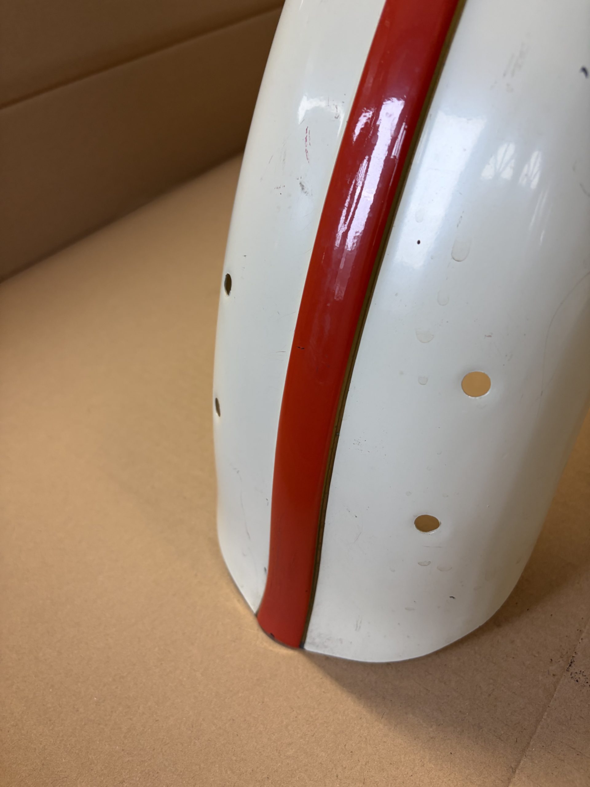 A genuine New Old Stock TR6 rear mudguard, painted in it’s original Aztec & Ivory Paint.